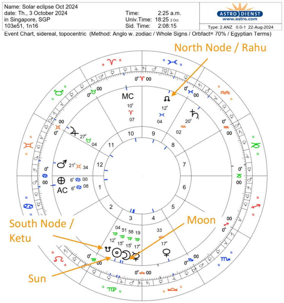 The chart above shows the solar eclipse taking place on 3rd October 2024 at about 02:25am SGT. Here, the dark moon (shown by the Moon and Sun together) takes place much closer to the nodes, within 4°, giving rise to an annular solar eclipse where the Sun is close to being completely blocked by the Moon.