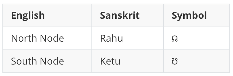 In vedic astrology, the north node is also referred to as Rahu while the south node is referred to as Ketu.
